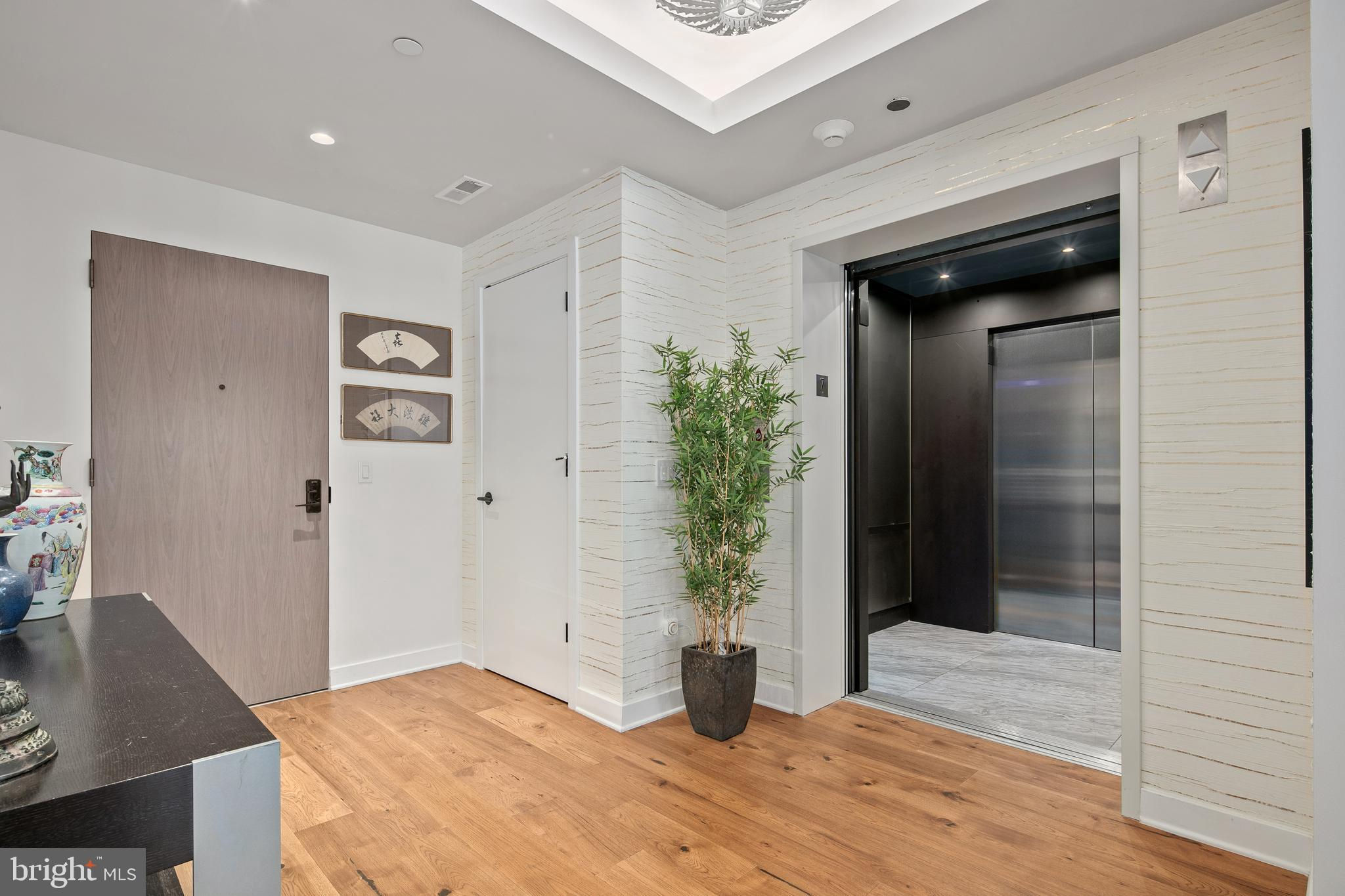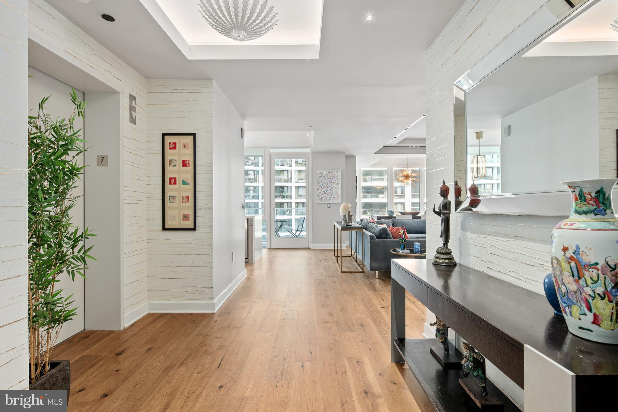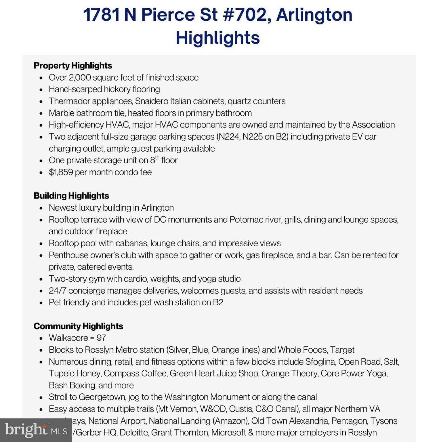 A stunning residence spanning over 2,000 square feet, accessible via private elevator, with 2BR+Den and 2.5 baths and two private balconies, in Arlington's newest luxury building, Pierce Condominiums, situated in a walker's paradise with an enviable 97 out of 100 Walk Score. Two adjacent, full-size parking spaces with a private EV car charging outlet and private storage convey with the sale. WHAT MAKES THIS UNIT STAND OUT? A private elevator opens to beautifully appointed rooms, wrapped in floor-to-ceiling windows, enhanced with high ceilings and exceptional finishes. Luxurious features include hand-scraped hickory floors throughout, Thermador appliances, Snaidero Italian cabinets, marble tile, heated bathroom floors, and high-efficiency heating and cooling systems. A separate laundry and storage room, private EV car charging at your adjacent parking spots (N224, N225 on P2), and a convenient private storage unit bring the comforts of a single-family home to condo living. The current owner has enhanced the spacious den with glass french doors to add natural light and improve function. WHAT MAKES THIS BUILDING STAND OUT? Arlington's newest luxury, full-service building located in Arlington's premier zip code offers an unmatched amenity package including a rooftop terrace offering spectacular views of DC monuments and the Potomac River, grills, multiple dining and lounge spaces, and an outdoor gas fireplace. Adjacent to the rooftop terrace is the pool with cabanas, lounge chairs, and impressive views. The penthouse-level owner's club provides another jaw-dropping space to gather or work, with a gas fireplace, multiple gathering spaces, tables, and a bar. It can be rented out for private, catered events. The two-story fitness center includes cardio equipment, weights, and a yoga studio while the friendly 24/7 concierge manages deliveries, welcomes guests, and assists with resident needs. WHAT MAKES THIS LOCATION STAND OUT? Walk Score = 97! Blocks to Rosslyn Metro (Silver, Orange, and Blue lines). Numerous dining, retail, and fitness options within a few blocks include Sfoglina, Open Road, Salt, Barely Mac, Tupelo Honey, Compass Coffee, Green Heart Juice Shop, Orange Theory, Core Power Yoga, Bash Boxing, and more. Stroll to Georgetown, jog to the Washington Monument or along the canal, and walk to Whole Foods or Target! Easy access to multiple trails, all major Northern VA roadways, National Airport, National Landing (Amazon), Pentagon, Tysons, and more! Nestle/Gerber HQ, Deloitte, Grant Thornton, Microsoft, & more major employers in Rosslyn.