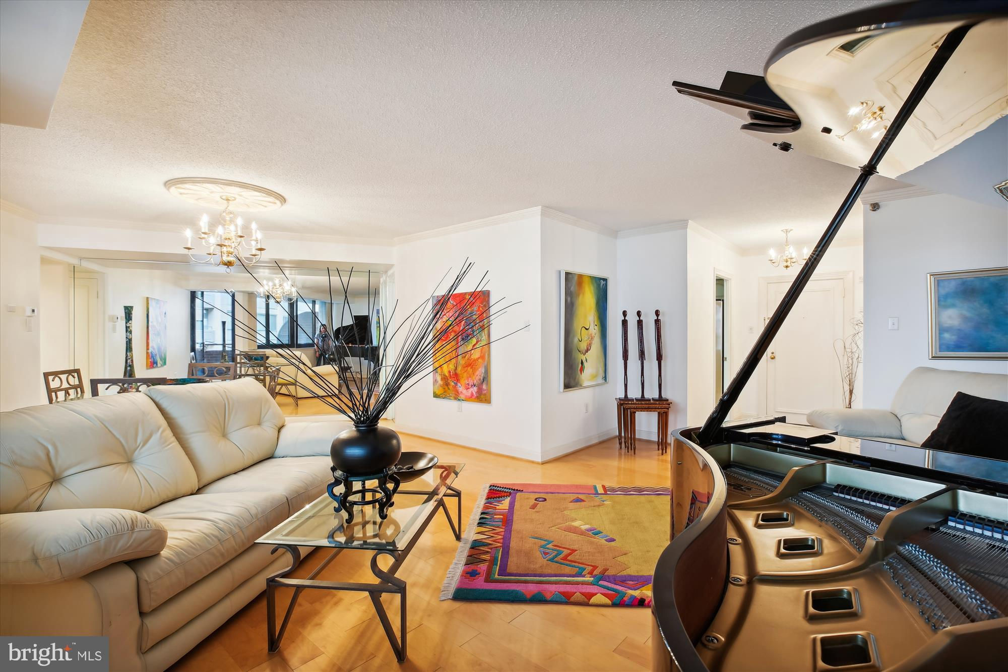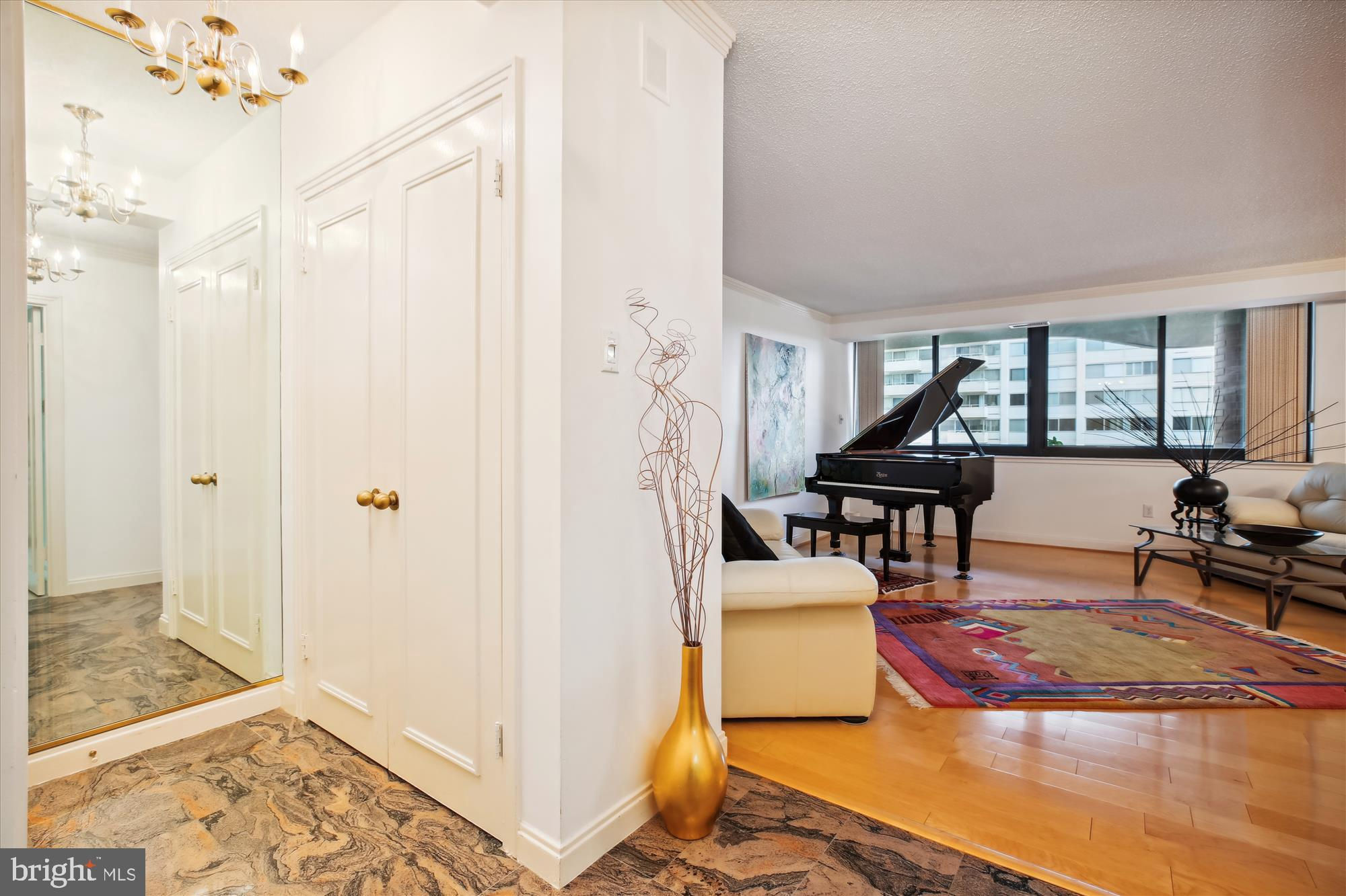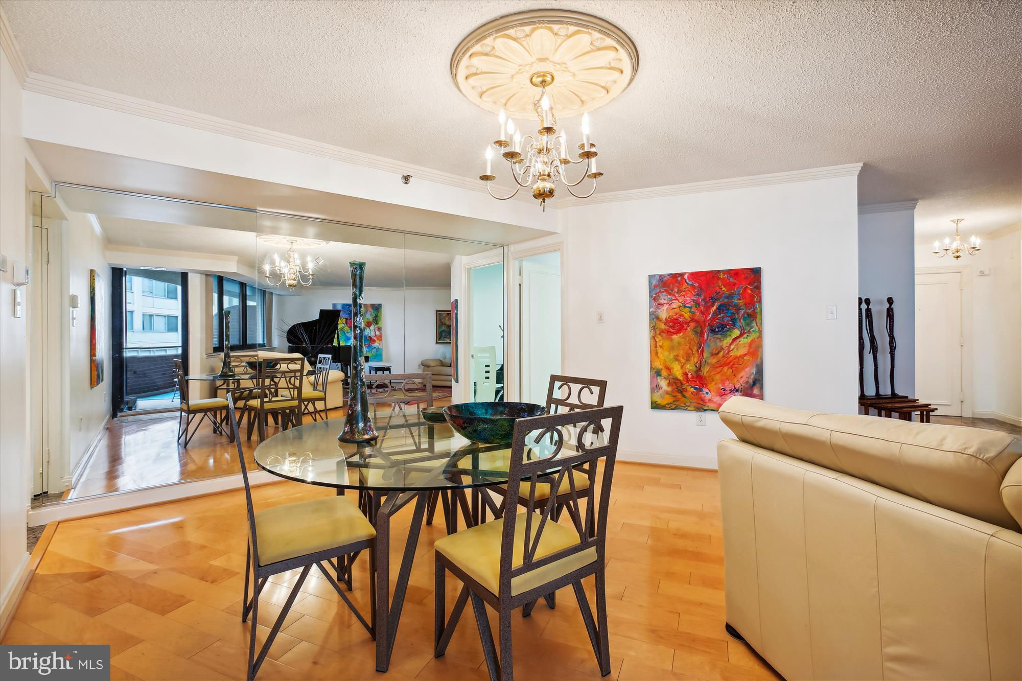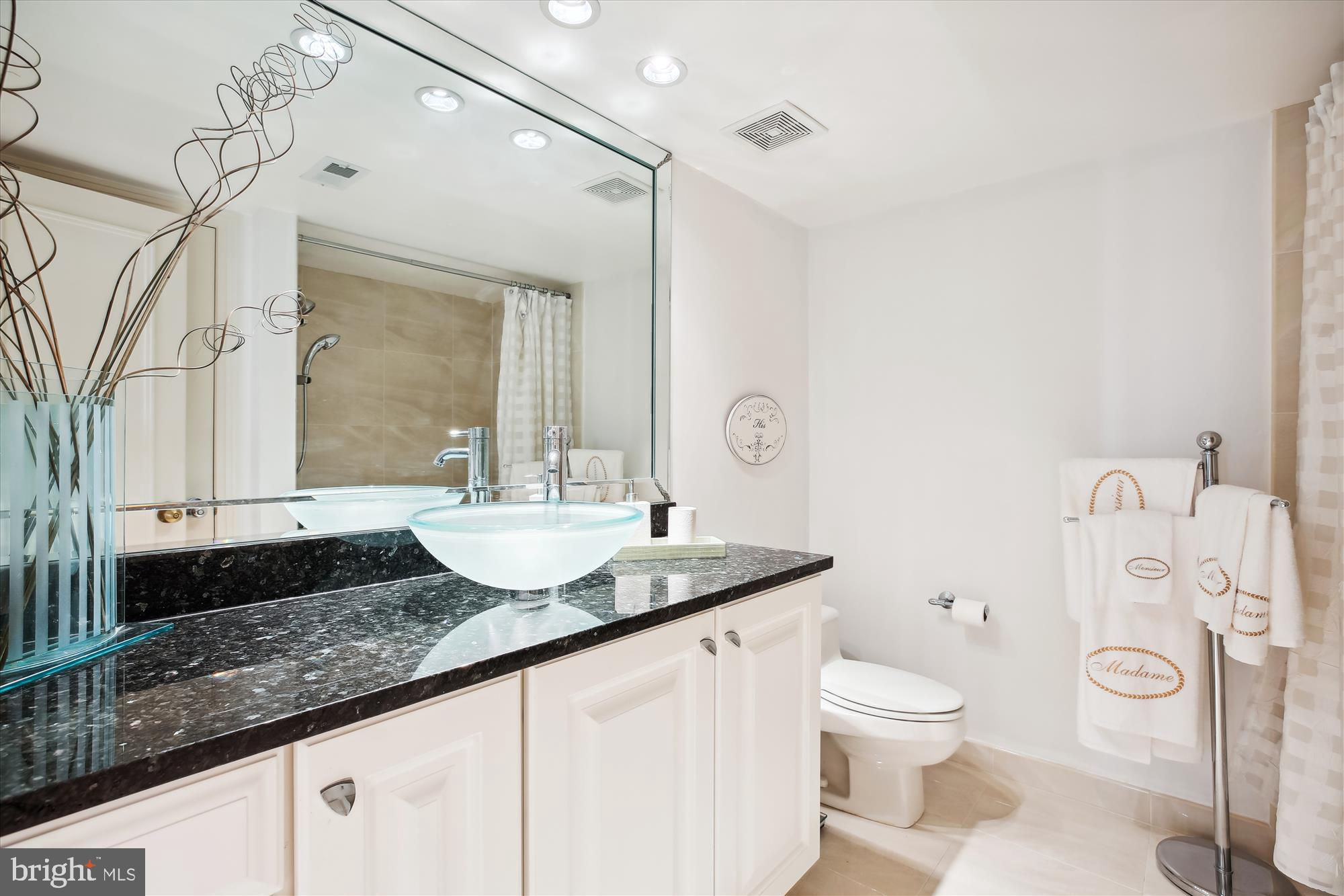 An amenity-rich condominium in The Carleton of Chevy Chase, a city dweller's dream located in the heart of Chevy Chase, brings together the finest in convenience and location. This wonderful expansive unit (1,310 sq ft) has undergone extensive updating and offers two well-proportioned bedrooms, two beautifully renovated full bathrooms, great entertainment flow, a large balcony, and expansive windows with fantastic views and exceptional natural light. The inviting Brazilian granite foyer sets the tone for the unit. The foyer leads to the open-concept, light-filled living room with maple wood flooring and crown molding which opens to an upscale dining area providing the perfect entertainment space with amazing windows and tree-top city views, plus access to the balcony! The well-equipped table space kitchen features stainless steel appliances, handsome wood cabinetry, exquisite granite counters with Italian porcelain tile backsplash, and a convenient pantry. The generous primary bedroom suite has wall-to-wall carpeting, fantastic natural light, and a private renovated bathroom with custom etched glass doors, a double vanity, Italian porcelain tile flooring, a wall closet, and a walk-in closet. The bright second bedroom features wall-to-wall carpeting, a large picture window, and a wall closet. The unit is complete with a renovated hall bathroom with an oversized granite vanity, a hall closet, a washer/dryer in the laundry closet, and a coat closet. The Carleton of Chevy Chase is a boutique building with a 24 hour front desk, 12 floors of residences and 4 floors of underground garage parking directly accessible by the building’s 2 elevators. Amenities include a fitness center, a heated swimming pool with a sun deck, a tranquil courtyard garden, a sauna facility, a card room, and a party room. This extraordinary building offers the perfect city lifestyle and offers various activities for it's residents. The Carleton is within steps of the Metro, groceries, parks, public transportation, Starbucks, Whole Foods, and the fine dining and shopping of Friendship Heights and Chevy Chase! Pet friendly building. Assigned garage parking.